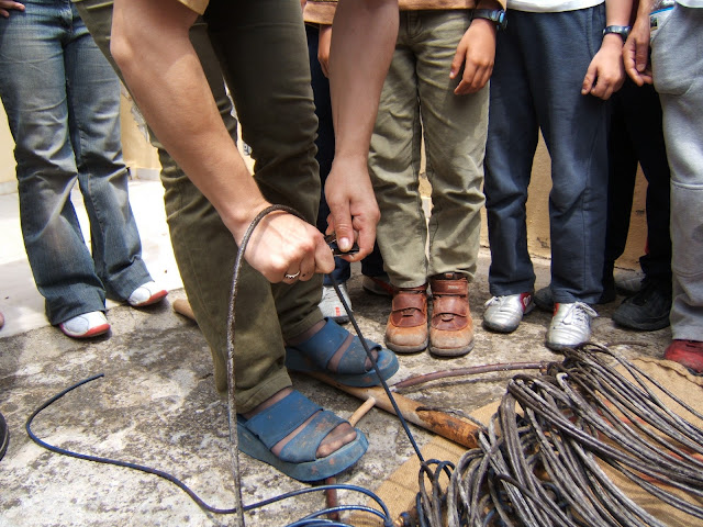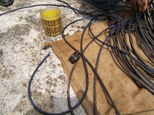 Οι αλαδανάρηδες αποθέτουν τα αργαστήρια, αρκετή ώρα κάτω από τον ήλιο για να μαλακώσει η μαύρη πάστα που βρίσκεται πάνω στα λουριά.